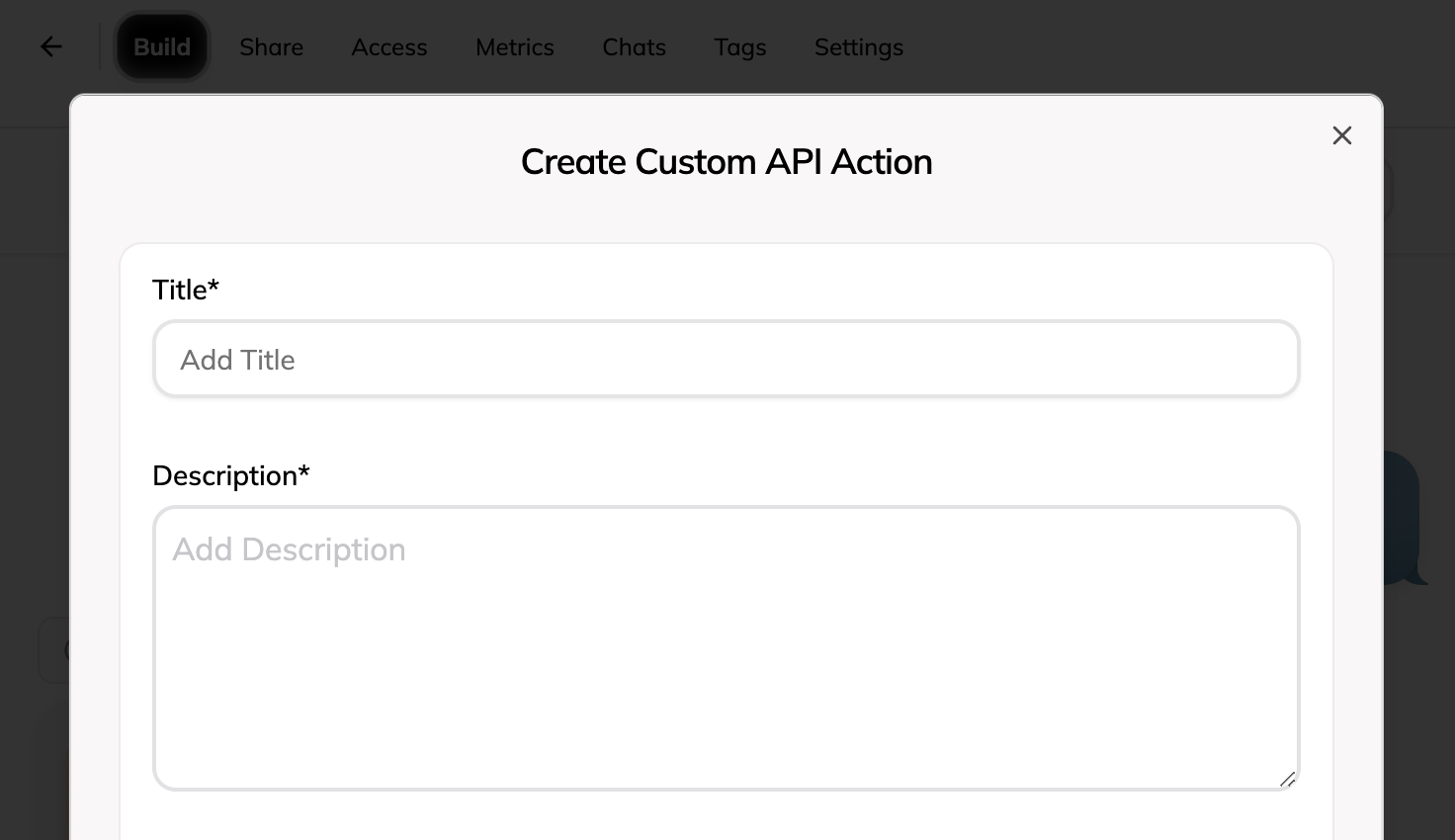 Navigate to [app.chipp.ai](https://app.chipp.ai) → Your App → Build → Capabilities → Add Custom Action